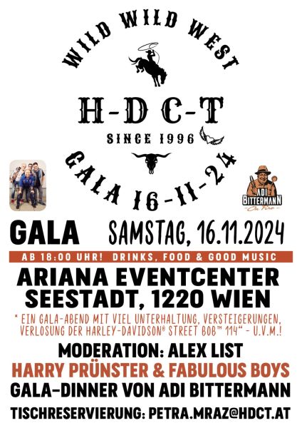 Freut Euch auf unglaubliche Live-Auftritte, die Verlosung der Harley-Davidson „Street Bob 114“, eine Reihe von Versteigerungen und die Verleihung der Charity-Awards. Für die kulinarischen Genüsse sorgt Adi Bittermann mit seiner Crew.