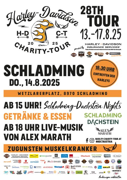 Die Harley Davidson Charity Tour in Schladming ist mehr als nur ein Event; es ist ein herzliches Zusammenkommen, das an das Gefühl von Heimat erinnert. Die malerische Kulisse von Schladming bietet den perfekten Hintergrund für dieses großartige Fest, bei dem sich alles um Gemeinschaft, Freude und Großzügigkeit dreht. Die Teilnehmer und Besucher können nicht nur die kraftvollen Motorräder bewundern und die lebendige Atmosphäre genießen, sondern auch einen wertvollen Beitrag leisten. Der Abend wird durch die gesammelten Spenden abgerundet, die einen bleibenden Eindruck hinterlassen und das Event zu einem unvergesslichen Erlebnis machen. Ein herzliches Dankeschön an alle Beteiligten.