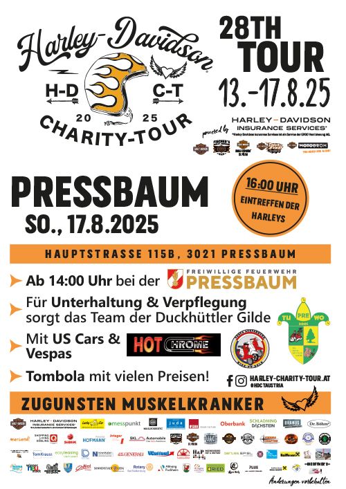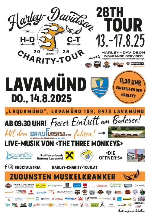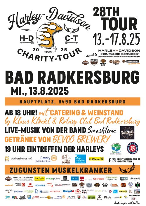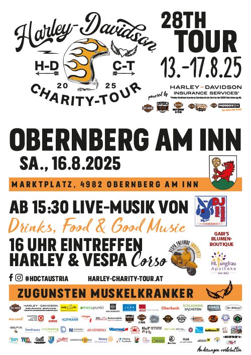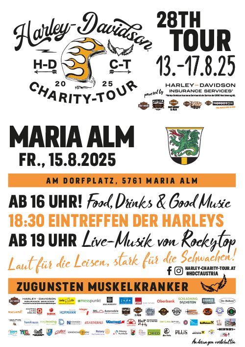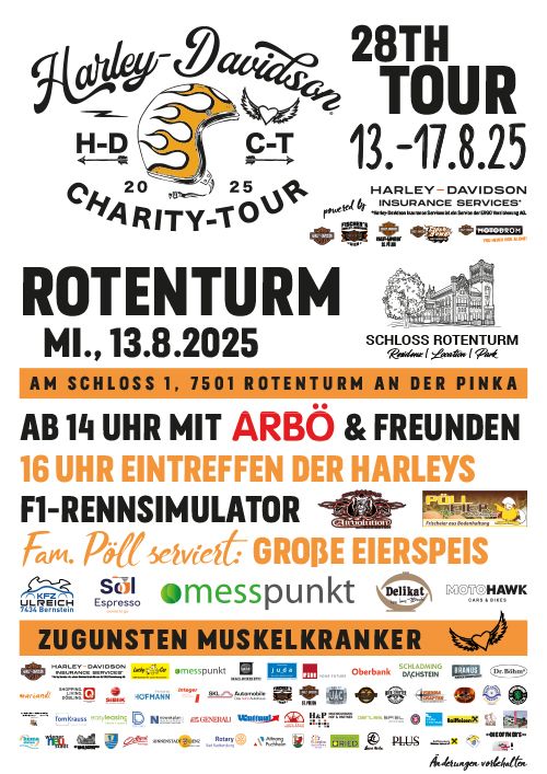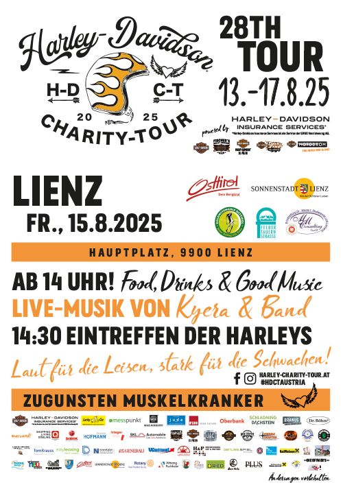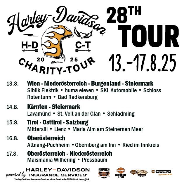 Unterstützt wird die Harley-Davidson® Charity-Tour von zahlreichen Sponsoren, darunter: Harley-Davidson® Company, Harley-Davidson® Insurance Services, Lucky Car, messpunkt, Juda, FILL, Oberbank, Mail Boxes Etc., Linz AG, Fischer’s Harley-Davidson, SKL Automobile, um nur einige zu nennen.
