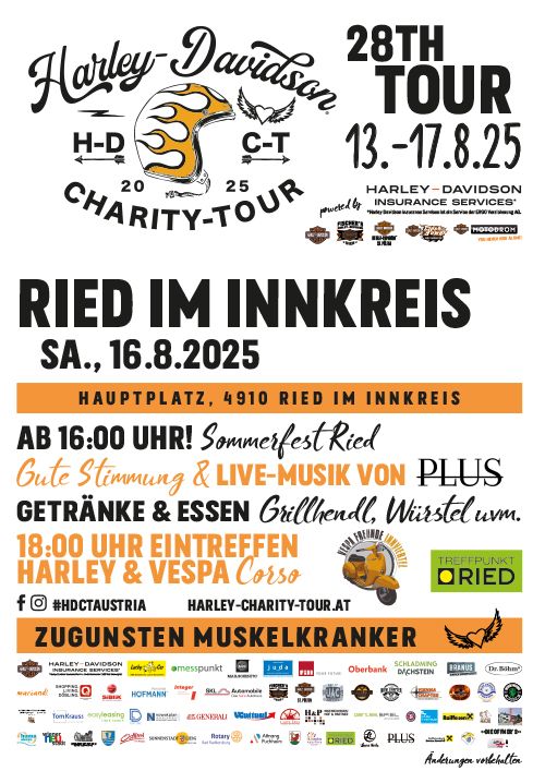 Am Samstag führt die Tour um 13:00 Uhr nach Attnang-Puchheim, wo die Spendenaktion fortgesetzt wird und „Black Belt Disaster“ den Rathausplatz rocken. Weiter geht es nach Obernberg am Inn, einem der schönsten Marktplätze Österreichs, wo sich viele Vespa-Fahrer aus dem Innviertel dem Tross anschließen, um dann in einem großen Corso nach Ried im Innkreis zu fahren. Dort wird zu Gunsten der HDCT ein Sommerfestival veranstaltet, um tausende Besucher mit der musikalischen Unterstützung von PLUS zum Spenden zu animieren. Hier verschmelzen die Leidenschaft für das Motorradfahren und das unermüdliche Engagement für muskelkranke Menschen zu einem unvergesslichen Erlebnis für alle Beteiligten.